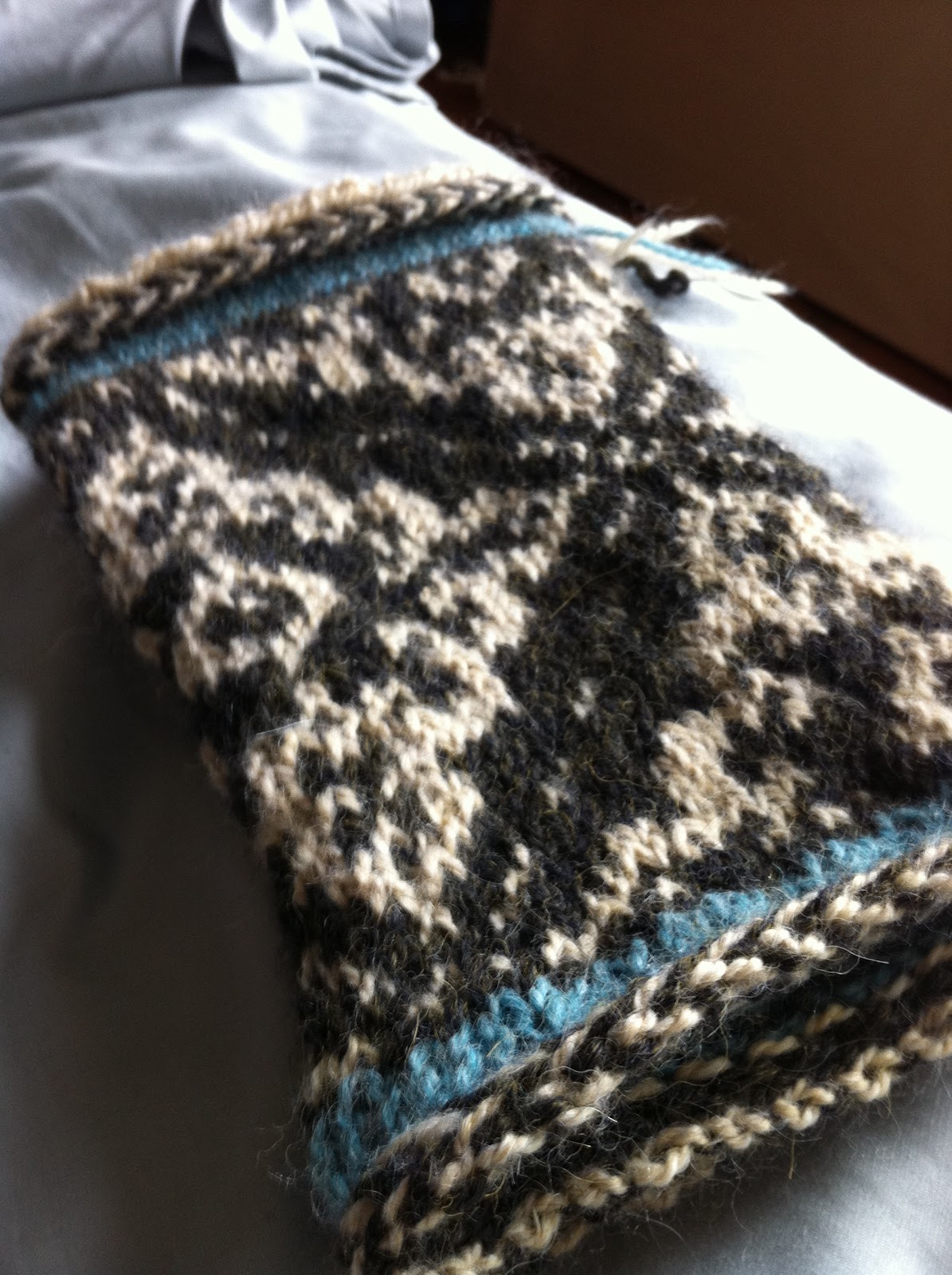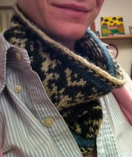 i completed my first colorwork project: the inga hat. i wanted to make it for my mom for her birthday, but i found out she is not fond of hats. halfway through the project i realized it was going to be too long (many people have suggested skipping 10ish rows because of this). stubbornly, i didnt listen to these wise souls and found myself most of the way through the hat, but before the decreases. as i came to this long-hat realization and decided to convert the project to a cowl.