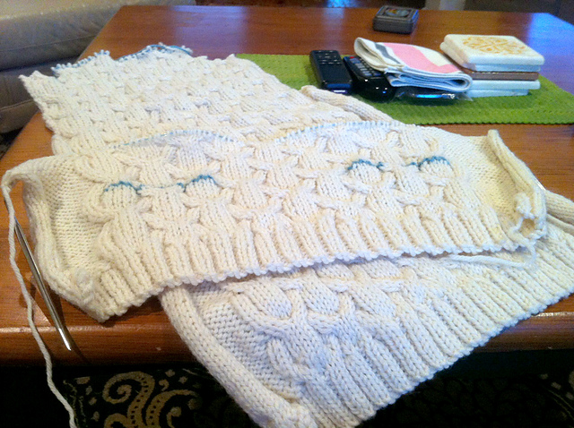 i am making progress on my sweater: the front is over half done. i am planning to block/seam/finish the collar and pockets before starting on the sleeves, we’ll see, maybe that’s cheating. i see a lot of people on ravelry complain about seaming, but i kind of love it. its the most motivating part for me, because im on the verge of finishing! i can go for a much longer time doing seaming/finishing than straight knitting. anyway, here’s where i am. you can see the blue melange yarn peeking out as stitch holders, but that’s what i plan to use for the pocket and collar linings. i am much further along than in this photo.