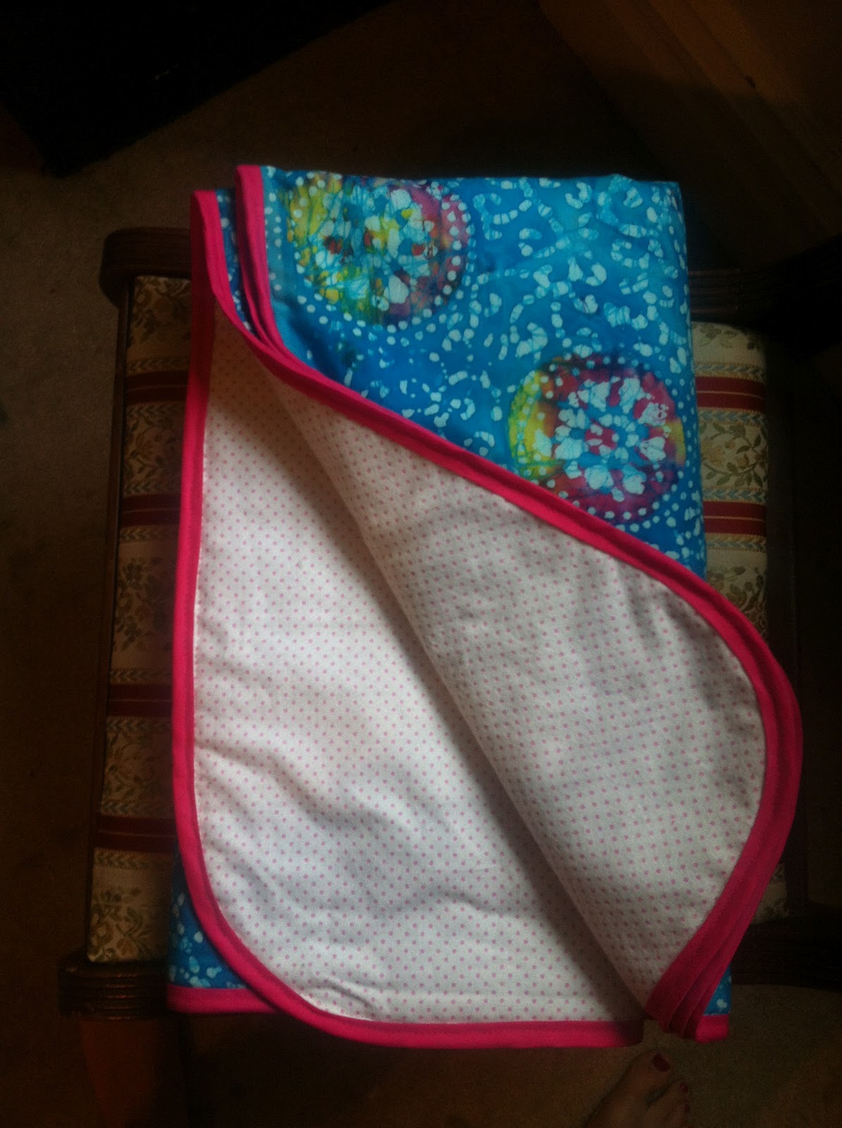 i finished the baby blanket! i used a multi-color cotton batik and a polka-dot flannel. i spent a while in the fabric store trying to find two flannels that looked good together, but as i was unsurely carrying around several bolts i happened upon the batik and thought it was so pretty. i like the pink bias tape for the color pop, too.