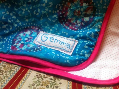 the tutorial was easy to follow, but im a little disappointed in my sewing skills… you wouldn’t think it would be so difficult to sew three rectangles into a little quilt, but whoa was i wrong. it took a lot of patience to cut out each piece correctly, and then to sew the bias tape on to the blanket. i can only hope mom-to-be and baby Gemma enjoy it. it took about 3 1 hour sessions to complete, and it cost about $25 to make. i considered making my own bias tape, but i think i will save that undertaking for a future project.