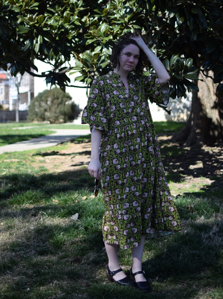 I impulse-purchased this beautiful jacquard fabric while looking in the denim and twill section at Mood last year. Obviously this busy pattern stood out among the solid denims and canvas. I am not sure why they decided to put it there, but I am so glad they did! Before cutting into this fabric, I made a toile first. I used a silk taffeta-esque remnant from PCCR and got sewing. My machine did not like making button holes with this silky fabric, so I went without. Overall the fit was pretty good, but the length was a little bit too short for me. For my jaquard version, I lengthened the pattern by 2″ and I am very happy with this adjustment. One reviewer of this pattern observed that the side buttons really elevate this garment, which I agree with. Mine are horn buttons from Fringe Supply Co (RIP) from my stash.