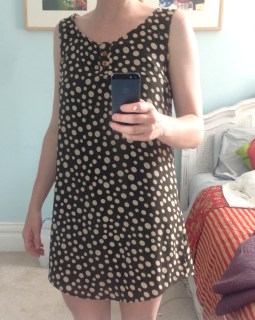 I made the “placket dress” I hinted at previously. the buttons are little wooden guys from joanns. It was a good learning experience, but I did a sloppy job. At worst, its a suitable house dress. At best, I can wear it to work with a cardigan. I based it loosely on the Colette Patterns Sorbetto, but I removed the pleat in the pattern piece, and lengthened about 14". The major issue was the bias tape facing did not get along very well with the placket. The fabric is some poly silky material, and I used leftover cotton bias tape.. not the best mix. Here is a bad pic: