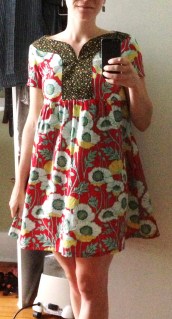 I also made a dress from the Japanese Stylish Dress Book. I LOVE it. Its shapeless with a ridiculous amount of ease in the back, but its my favorite thing I’ve made so far this year. I made the smallest size, even though the “size chart” advised me to make it two sizes bigger. If you want to buy this book, beware: you pretty much have to trace the pattern pieces (vs just cutting them out) because the 27 patterns are all on top of each other on 3 double sided giant pages. I suppose that is the “right way” to use patterns, but I usually take the lazy route and just cut out the pattern pieces straight from the pattern. I found it very time consuming to trace the pattern pieces with tracing paper, and then add seam allowances. Maybe thats how they do it in Japan. (Also, after I took this picture, i added a strip of the dark fabric at the bottom to lengthen the dress a bit– it was very short before).