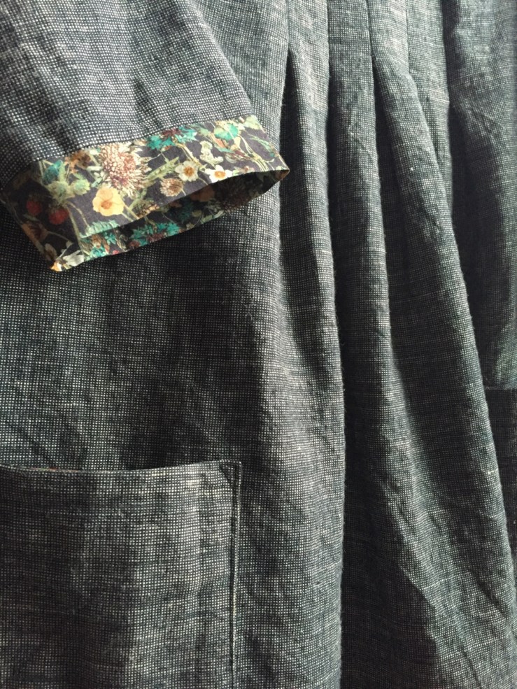 I used a Pickering hemp/wool blend from Spool, and its very toasty. Its the beginning of November and the forecast says 75, so I didn’t wear it to work today. The touches of Liberty are from a remnant I bought in Portland this spring. I had thought it was too dark and muddy to use a lot of, but instead I lined the patch pockets, made the facing, and finished the sleeve hems with it, and I think it looks lovely, and not muddy or dark at all!