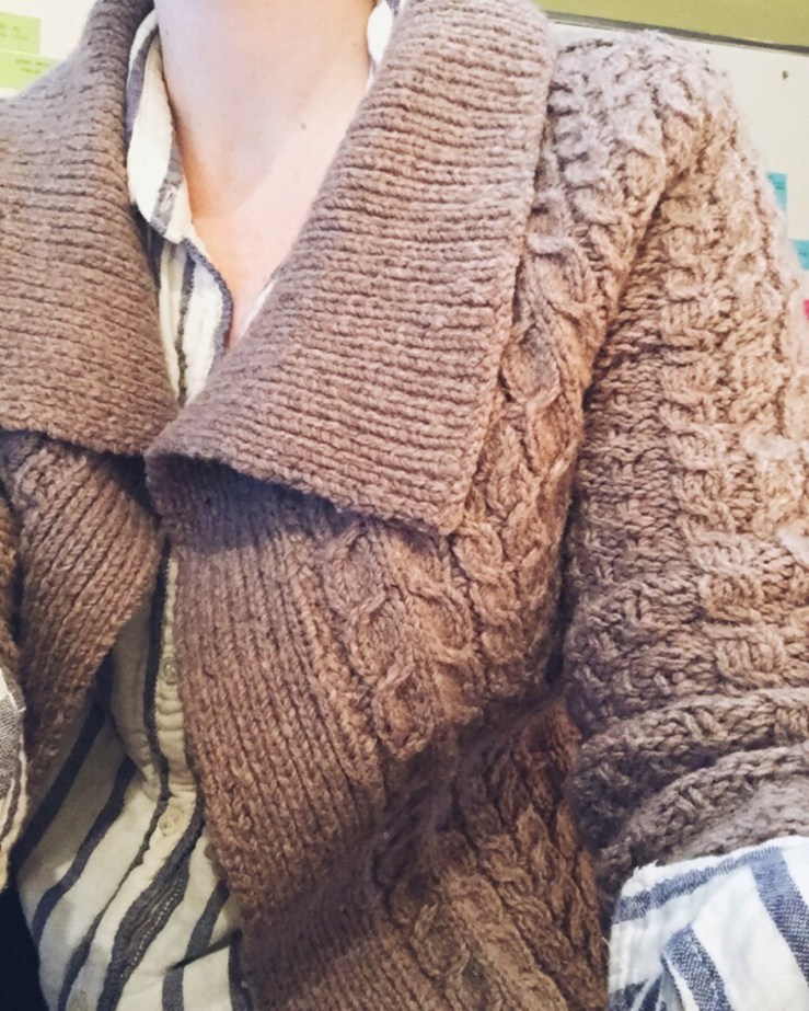 finally finished the back. might go back in and do a last big cable since it looks pretty long without one. the short rows were messing with my counting…